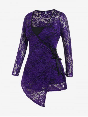 Plus Size Plunge Applique Crisscross Lace Hemline High Low Tee