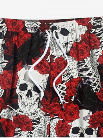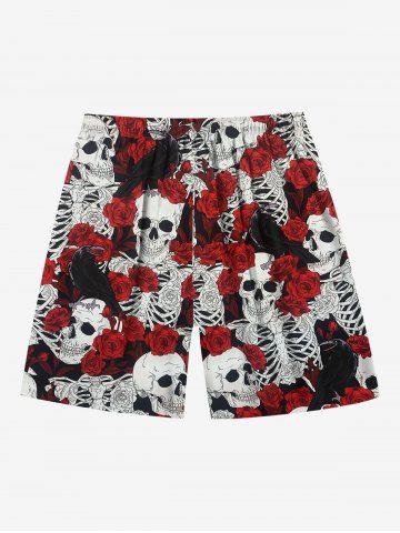 Plus Size Skulls Skeleton Rose Flower Crow Print Hawaii Beach Shorts For Men - Color Rojo Oscuro - L