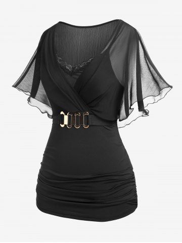 a*****95Plus Size Butterfly Sleeves Lace Panel Surplice 2 in 1 TeeColor: BLACK Size: 4X | US 26-28I like this shirt it is great for a professional look or a night on the town