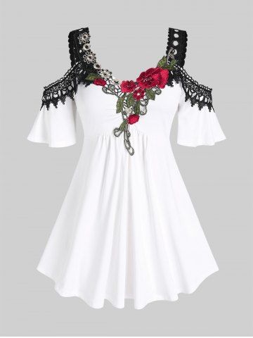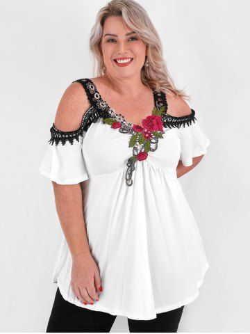 Camisetas de Talla Grande > Camiseta de Aplicación de Flor con Puntilla Escotada de Hombros Al Aire de Talla Extra