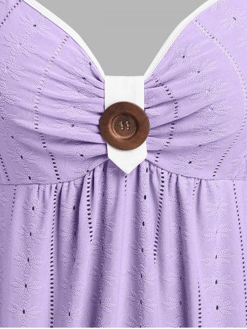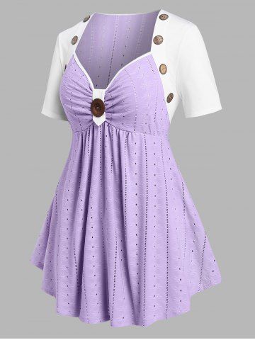 B*****s5Plus Size & Curve Mock Button Broderie Anglaise Colorblock T ShirtColor: LIGHT PURPLE Size: 3XBeautiful shirt with button embellishments and two tone. It's a bit low for me in the chest area so I'll wear a lace top underneath. The material is soft and comfortable, perfect fit, shipped fast and packaged nicely. High quality design and made very well!