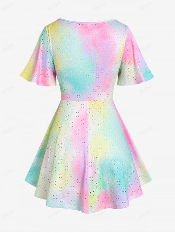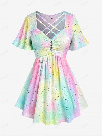 Plus Size Hollow Out Tie Dye Flutter Sleeves Strappy T-shirt