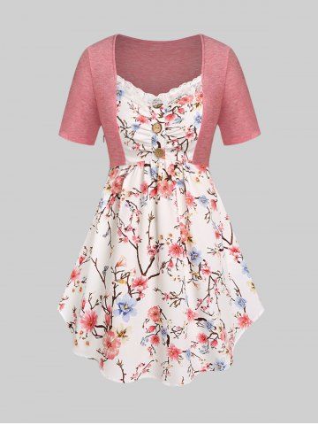 d*****n5Plus Size Floral Print Faux Twinset Irregular T ShirtColor: LIGHT PINK Size: L | US 12I really like this one too. It's thin and light weight. Very charming and petite looking, very feminine piece. The over piece is like cotton. Very soft. The front shirt piece is another type of fabric that I don't know but it feels good. This is a large. The front shirt piece doesn't go all the way around. Just to the sides and then it's sewn into the other piece. The only adjustment that I had to make was to pin up the spaghetti straps to lift up the front more. I ordered this on July 7, 2022 and received it yesterday on July 21, 2022. I give you the exact date and year so that way you know when it was and not guessing the year or anything so you know exactly how many days. I live in Maryland USA if that helps anyone. Rosegal is far away from me. I am 5 foot and 2 inches and I weigh 160 lbs. My belly sticks out more than I want but in person you can't tell. I wear a size 12= 13 jeans and you can see how nicely this lays in my hips. But grandmomma got back and I can't hide it. lol. As I am with all of my items, I recommend this shirt. You can wear it casually or a dress down. Wear it basically anywhere. The outer layer won't go over my chest area. That part is too small. But I like the open look.