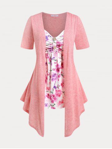 d*****n5Plus Size Floral Print Faux Twinset Irregular T ShirtColor: LIGHT PINK Size: L | US 12I really like this one too. It's thin and light weight. Very charming and petite looking, very feminine piece. The over piece is like cotton. Very soft. The front shirt piece is another type of fabric that I don't know but it feels good. This is a large. The front shirt piece doesn't go all the way around. Just to the sides and then it's sewn into the other piece. The only adjustment that I had to make was to pin up the spaghetti straps to lift up the front more. I ordered this on July 7, 2022 and received it yesterday on July 21, 2022. I give you the exact date and year so that way you know when it was and not guessing the year or anything so you know exactly how many days. I live in Maryland USA if that helps anyone. Rosegal is far away from me. I am 5 foot and 2 inches and I weigh 160 lbs. My belly sticks out more than I want but in person you can't tell. I wear a size 12= 13 jeans and you can see how nicely this lays in my hips. But grandmomma got back and I can't hide it. lol. As I am with all of my items, I recommend this shirt. You can wear it casually or a dress down. Wear it basically anywhere. The outer layer won't go over my chest area. That part is too small. But I like the open look.