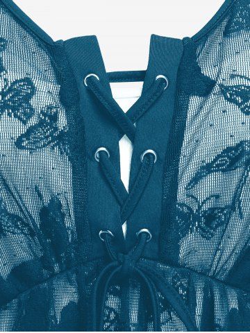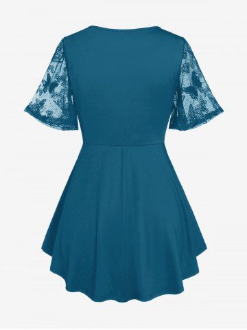 Plus Size Butterfly Lace Overlay Lace-up 2 in 1 Tee - Azul De Medianoche - 5x | Us 30-32