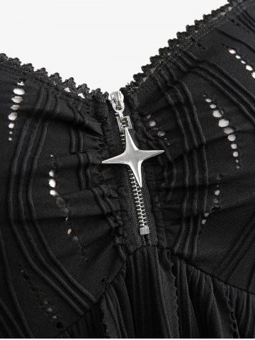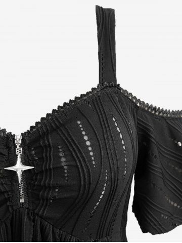 Plus Size Cold Shoulder Plaid Print Lace Up Cross Zipper Hollow Out Jacquard Ribbed Top - Negro - Negro