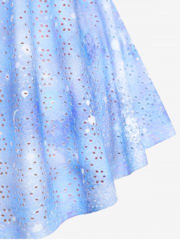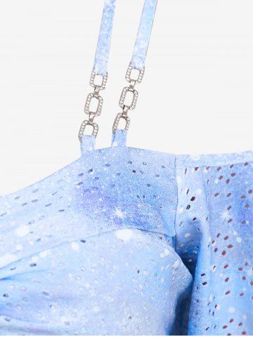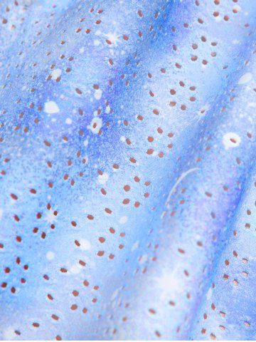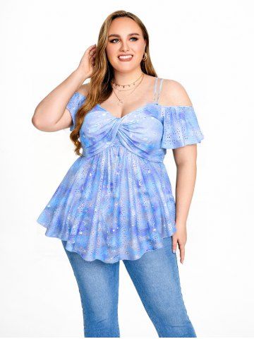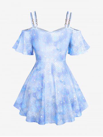 Plus Size Ombre Tie Dye Galaxy Moon Star Print Twist Chains Hollow Out Cold Shoulder Top - Azul Claro - Azul Claro