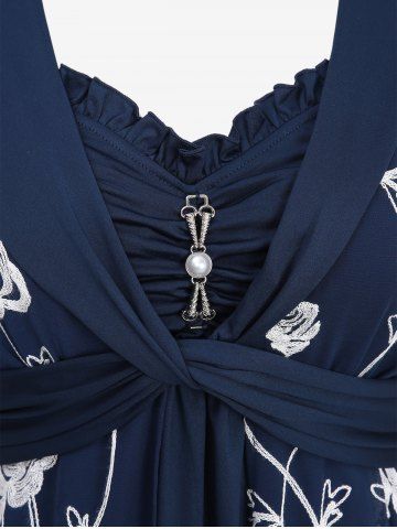 Plus Size Pearl Buckle Panel Ruched Twist Ruffles Embroidery Rose Flowers Chiffon 2 In 1 Top - Azul Profundo - 2x | Us 18-20