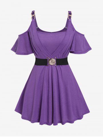 Plus Size Ruched Belted Chains Cold Shoulder Short Sleeve T-Shirt - Púrpura - Púrpura