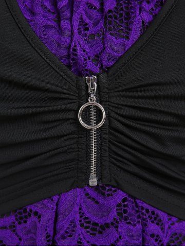Plus Size Zipper Fly Crop Top and Contrast Lace Cami Top Set