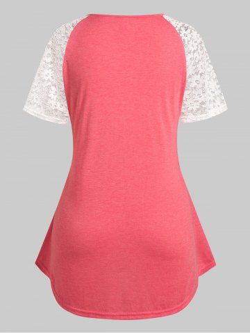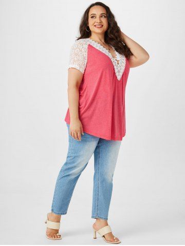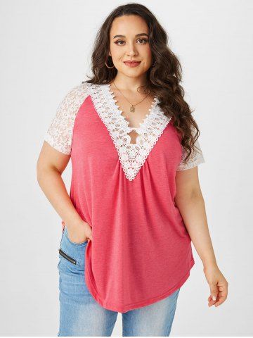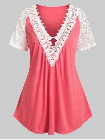 B*****b5Plus Size Lace Panel Plunging Neck TeeColor: LIGHT PINK Size: 3XI have a tank underneath this darling top so please excuse that. This is so pretty with sparkles added to the center of the flowers on the sleeves, makes the top really stand out. The lace on the sleeves is really sturdy and will last, the vee neck lace is a heavier matetial which is exceptional. The material is soft and comfortable. Shipped fast and packaged nicely. High quality design and made very well!