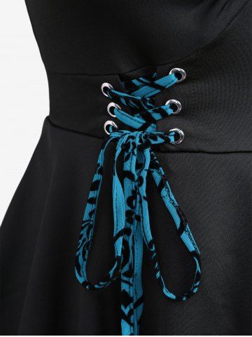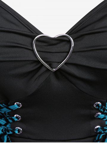 Plus Size Floral Flocking Tulip Hem Layered Ruffles Lace Up Ruched Heart Buckles Tank Top - Azul - Azul