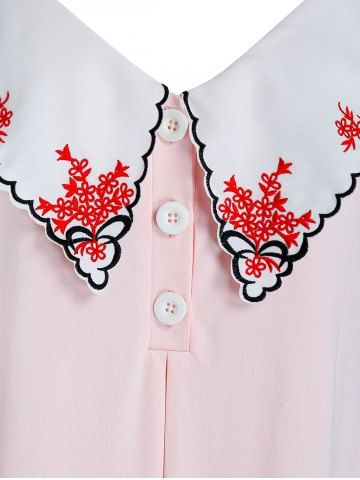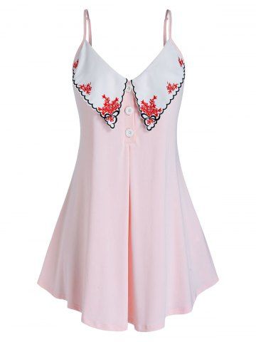 B*****b5Plus Size Scalloped Embroidered Placket Tunic Cami TopColor: PIG PINK Size: 3XGreat summer top with accent collar with embroidered flowers. The material is soft and comfortable, perfect fit, shipped fast and packaged nicely. High quality design and made very well!