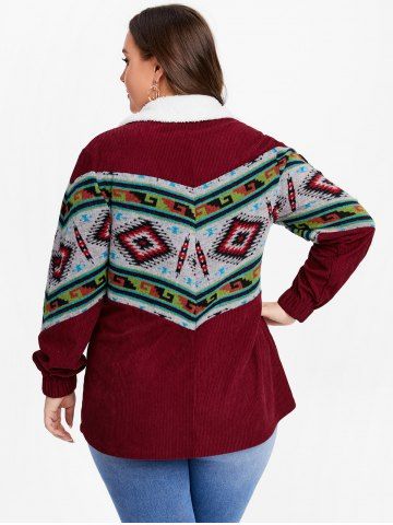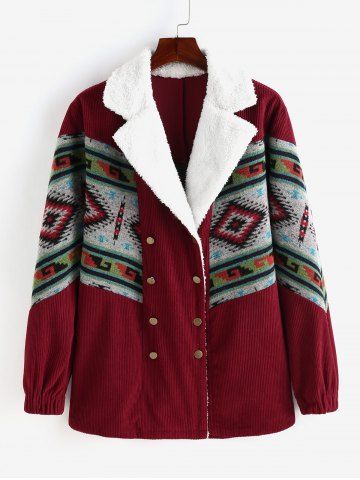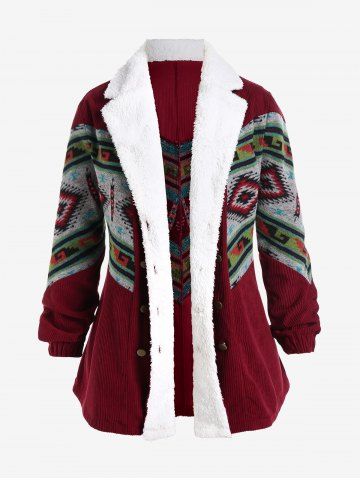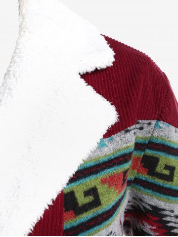 Plus Size Ethnic Jacquard Combo Corduroy Faux Shearling Jacket