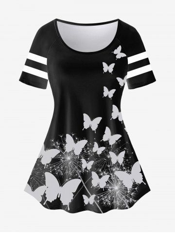 j*****n5Plus Size Butterfly Print Striped Detail Raglan Sleeve T-shirtColor: BLACK Size: 3X | US 22-24I love these shirts because I love that the fabric is comfortable wrinkle free and doesn’t attract pet hair. I get compliments on all of my clothing from them so recommend this site I order 1 to 2 sizes up from USA sizes and the fit is perfect.