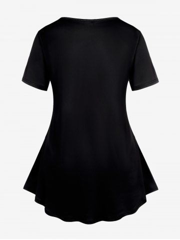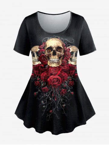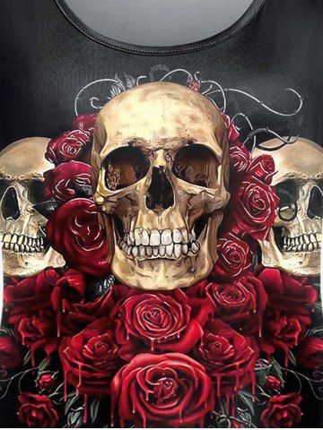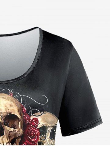 Camiseta de Cuello Redondo con Pintura de Rosa de Cráneo Gótico - Negro - Negro