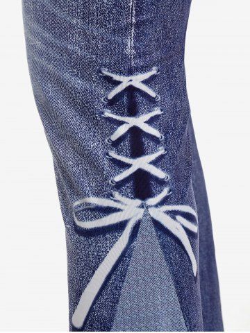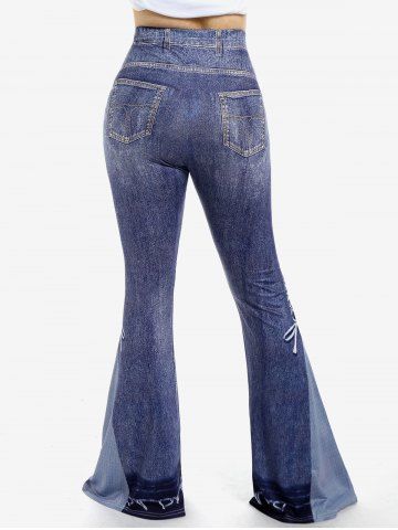 A*****e5Plus Size 3D Jeans Lace-up Pattern Printed Pull On Flare 70s 80s Disco PantsColor: LIGHT BLUE Size: 2X | US 18-20soft silky feeling printed legging pants. love the flare at the bottom. super comfy. best to wear with a little heel as they are a bit longer, they still are amazing.