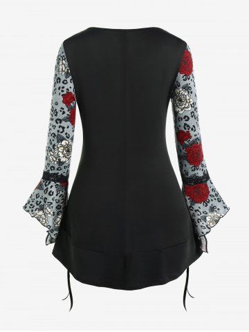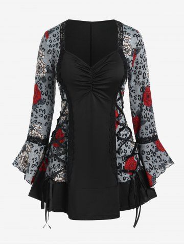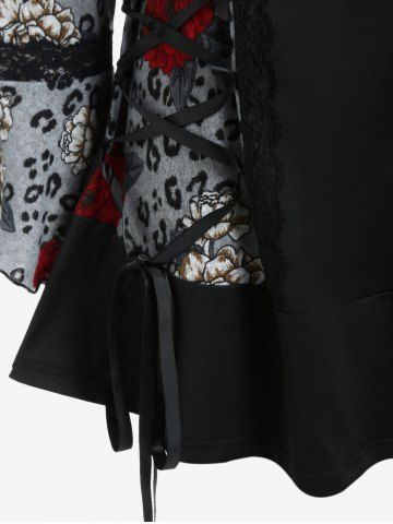 Y*****e5Gothic Lace Up Crisscross Grommets Flounce TeeColor: BLACK Size: 3X | US 22-24Love the lacing and the lace trim on bottom. Super cute top hugs my curves and looks very flattering! This will be one of my faves! It’s a polyester fabric, medium sheerness so should be good in warmer and cooler weather.