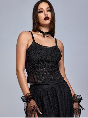 Gothic Guipure Lace Applique Sheer Mesh Camisole And Gothic Lace Mesh Panel Flounce Pull On Midi Skirt Gothic Outfit