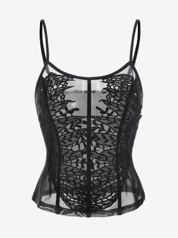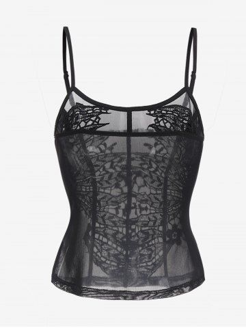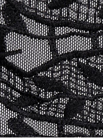 Camiseta de Malla Trasparente con Apliques de Encaje Ahuecado - Negro - Negro