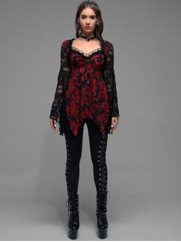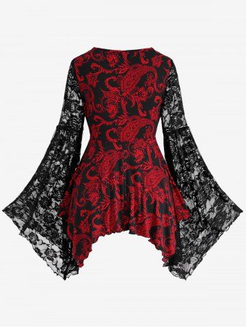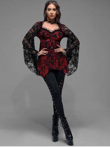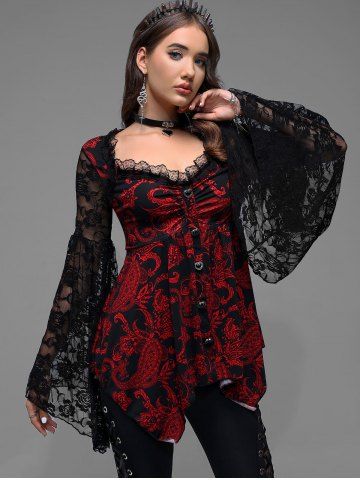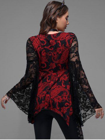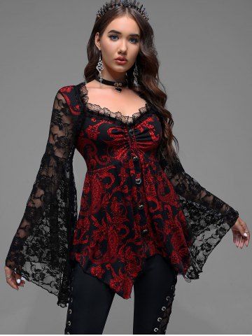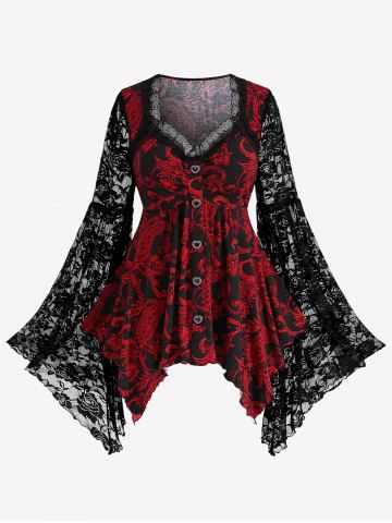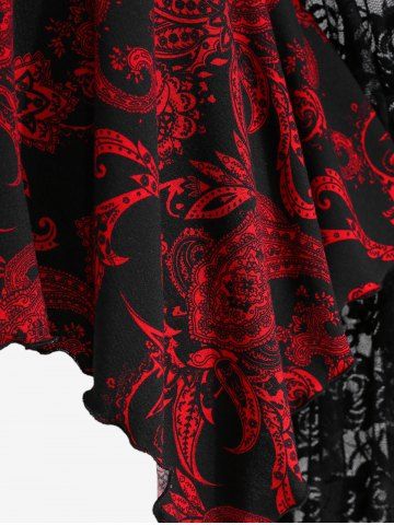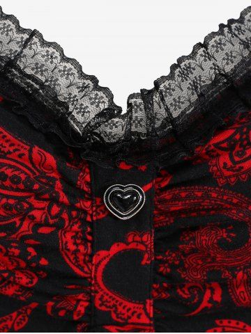 Gothic Paisley Print Floral Lace Heart Buttons T-shirt - Rojo - Rojo