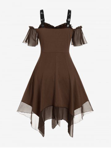 Gothic Plus Size Cold Shoulder Lace Up Grommet Handkerchief Chiffon Asymmetric Dress - Café Profundo - 2x | Us 18-20