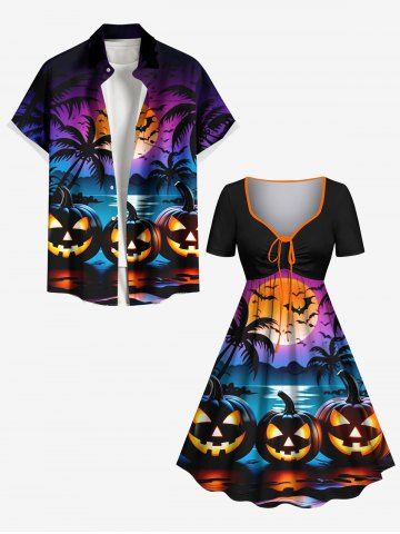 Couple Halloween Outfits > Halloween Pumpkin Coconut Tree Moon Bat Print Plus Size Matching Outfit For Couples