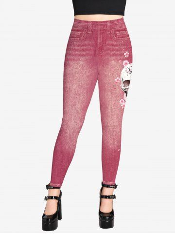 Jeggings Góticos de Estampado de Cráneo de Flores 3D - Rosa Claro - Rosa Luz