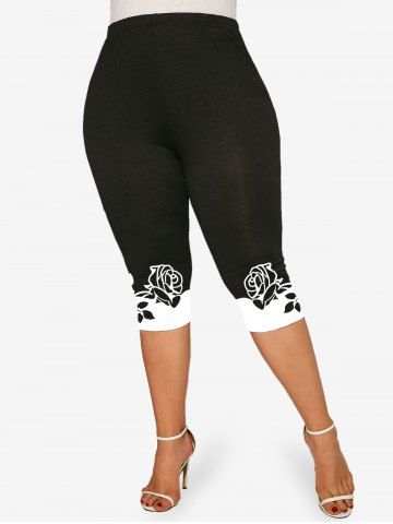 Leggings Capri de Cintura Alta con Estampado de Rosa de Color Bloque - Negro - Negro