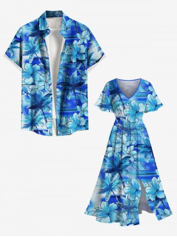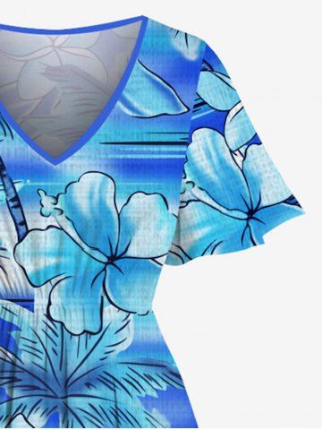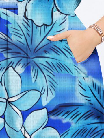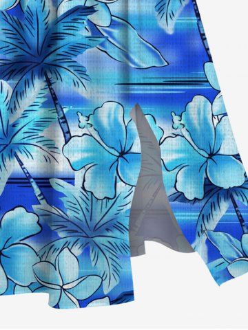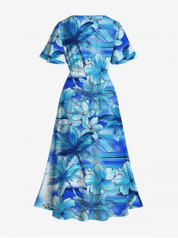 Plus Size Coconut Tree Hibiscus Flowers Tie Dye Print Split Hawaii Midi Dress - Celeste - Cielo Azul