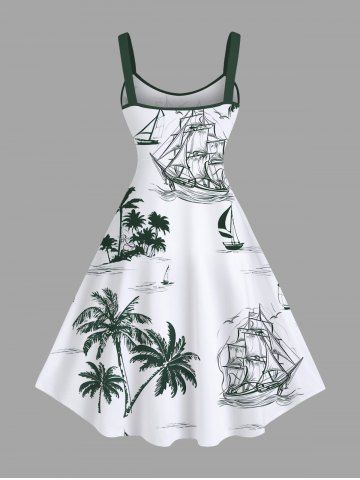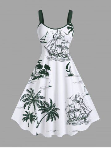 Plus Size Coconut Tree Sailboat Cruise Print Hawaii A Line Tank Dress - Blanco - Blanco