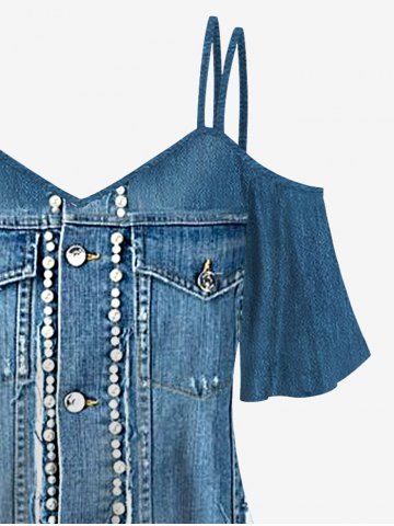 Plus Size Cold Shoulder 3D Glitter Sparkling Sequins Buttons Pearl Pocket Denim Print Ombre T-shirt - Gris Azulado - 6x