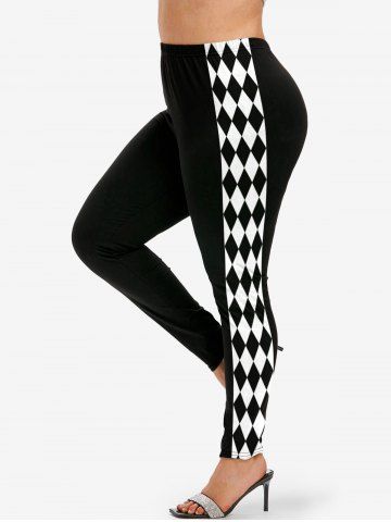 Halloween Clown Costume Plus Size Colorblock Rhombus Print Leggings Jester Lady - Negro - Negro