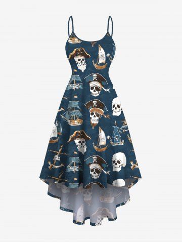 Plus Size Cruise Pirate Skulls Sailboat Print High Low Hawaii Cami Dress - Azul De Medianoche - Xs
