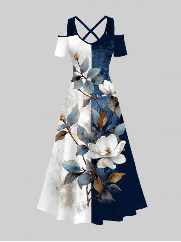 Plus Size Distressed Colorblock Flowers Leaf Print Cold Shoulder Crisscross Hawaii Maxi Dress