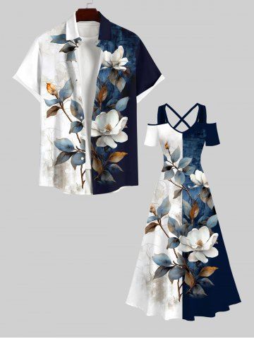 Distressed Colorblock Flowers Leaf Print Plus Size Matching Hawaii Beach Outfit For Couples