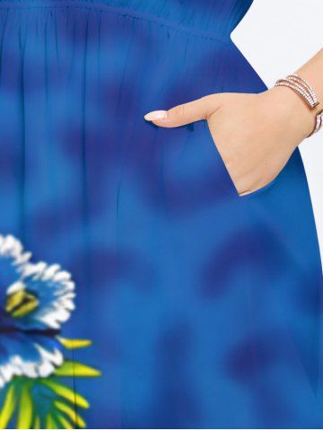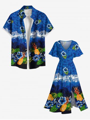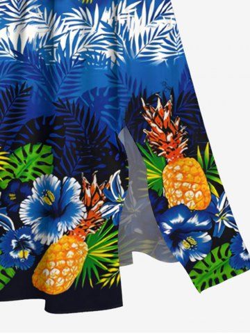 Plus Size Floral Pineapple Tropical Leaves Print Hawaii Ombre Split Pocket A Line Midi Dress - Azul - Azul