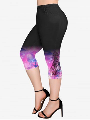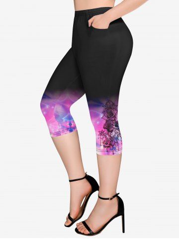 Plus Size Floral Print Ombre Pocket Capri Leggings - Negro - Negro