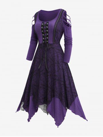 Halloween Dresses > Plus Size Grommet Lace Up Spider Web Mesh Cold Shoulder Braided Sleeves Dress