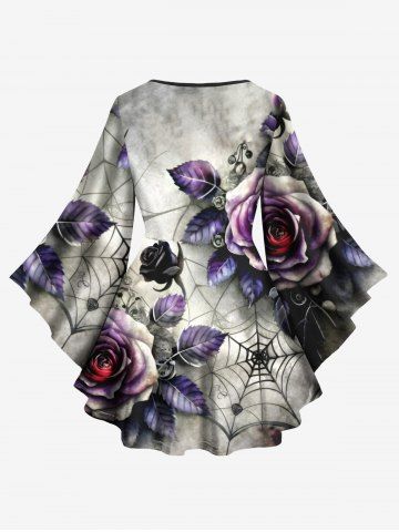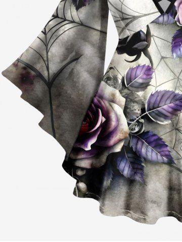 Halloween Tops > Plus Size Halloween Costume Rose Flower Leaf Spider Web Print Crisscross Lattice Flare Sleeve T-shirt
