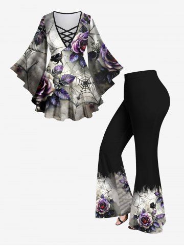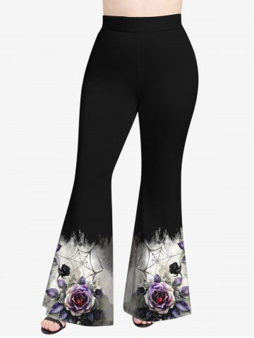 Plus Size Halloween Costume Rose Flower Leaf Spider Web Print Flare Pants - Negro - Negro