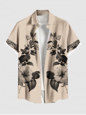 Short Sleeves Shirts > Plus Size Hibiscus Flower Leaf Branch Ethnic Print Hawaii Button Pocket Shirt For Men