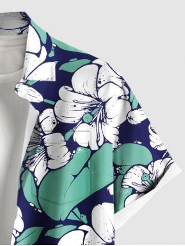 Plus Size Hibiscus Flower Leaf Tropical Print Buttons Pocket Hawaii Shirt For Men - Celeste - Cielo Azul