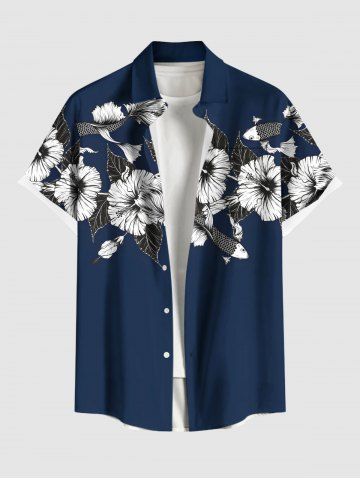 Plus Size Hibiscus Flowers Leaf Fish Tropical Print Buttons Pocket Hawaii Shirt For Men - Azul Profundo - S