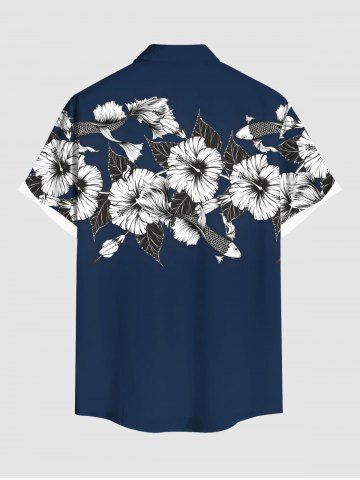 Plus Size Hibiscus Flowers Leaf Fish Tropical Print Buttons Pocket Hawaii Shirt For Men - Azul Profundo - 6xl