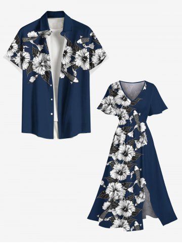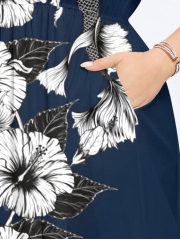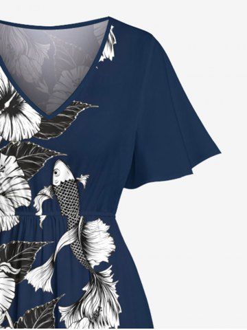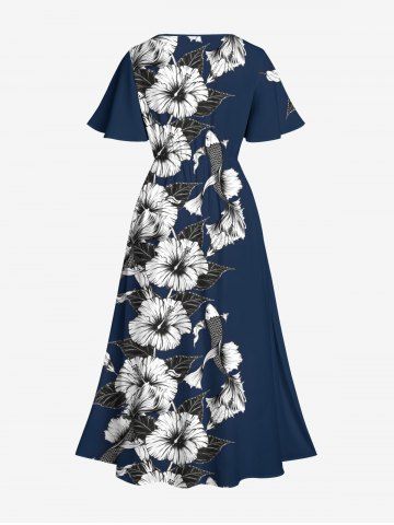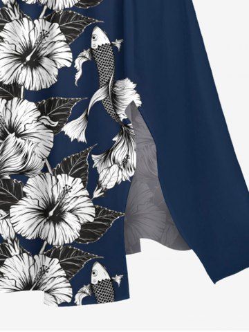 Plus Size Hibiscus Flowers Leaf Fish Tropical Print Split Hawaii Midi Dress - Azul Profundo - 6x