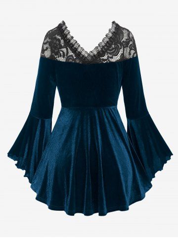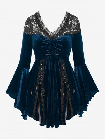 Alternative & Gothic Tops > Gothic Plus Size Lace-up Cinched Ruched Lace Trim Velvet Flare Sleeves Top