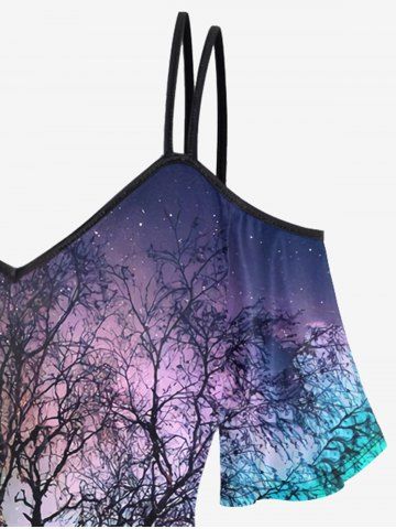 a*****m5Ombre Trees Print Cold Shoulder T-shirt and Flare Pants Plus Size 70s 80s OutfitsColor: PURPLEThis product fit amazingly and is so soft and breezy and i get compliments every time i wear it.