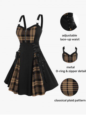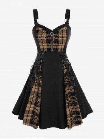 Alternative & Gothic Dress > Gothic Plus Size Plaid Colorblock Print Lace Up Half Zipper Patchwork Fit and Flare Dress