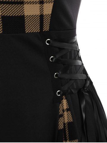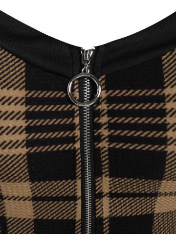 Gothic Plus Size Plaid Colorblock Print Lace Up Half Zipper Patchwork Fit and Flare Dress - Café - Café
